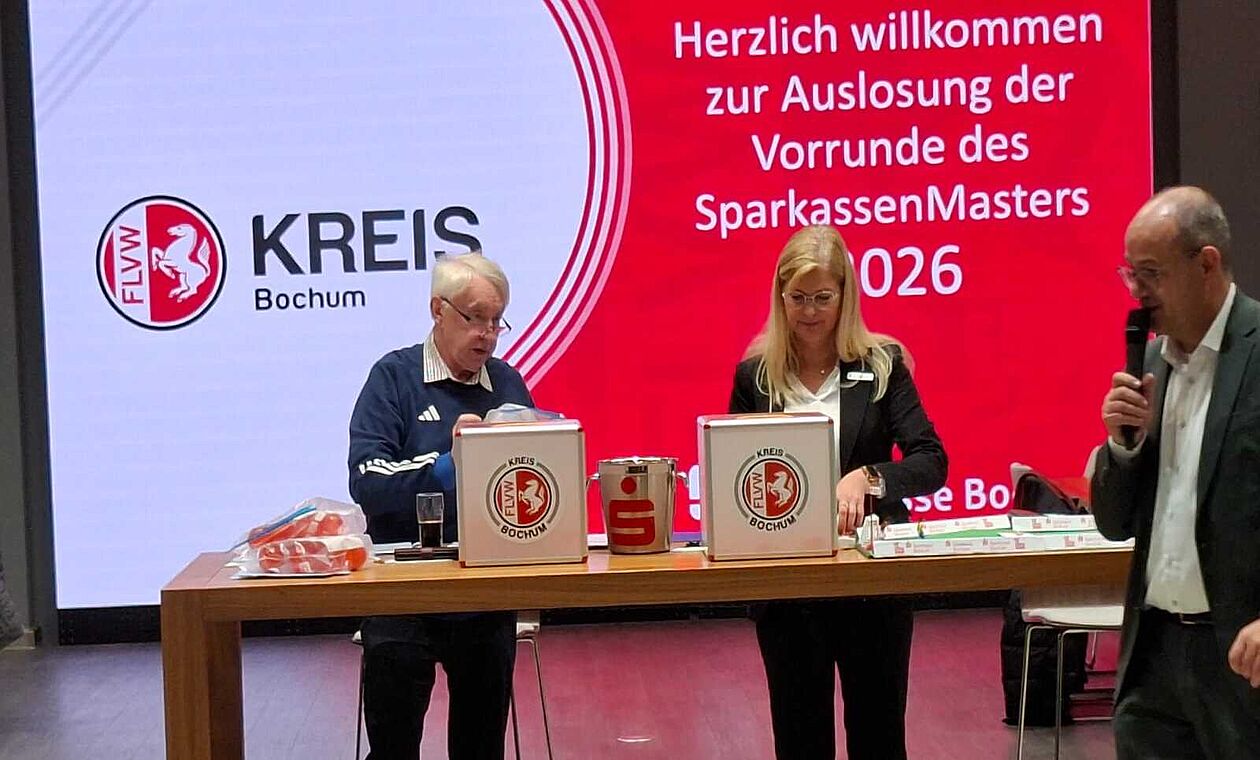 Die Auslosung der Gruppen fand am 24.11.2025 im Haupthaus der Sparkasse Bochum statt, wobei die Lose unter Aufsicht von Bernhard Adler, KFA Kreis Bochum, von Anja Kenkmann, Vorstandsstab der Sparkasse Bochum gezogen wurden. Unterstützt wurde sie dabei von Axel Zimmermann, dem Kreisvorsitzenden, der die Veranstaltung eröffnete und die Vereinsvertreter herzlich willkommen hieß.